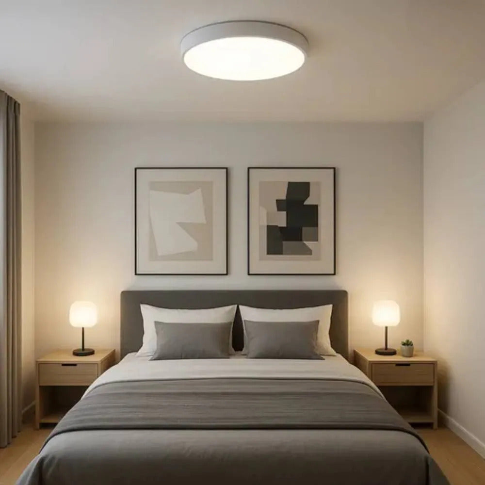Seu design atemporal em formato redondo, com 30 cm de largura por 5 cm de altura, harmoniza com quartos e salas de jantar, trazendo aconchego e sofisticação discreta. Além disso, conta com sistema de ajuste prático de temperatura de cor, permitindo alternar entre 3000K, 4000K e 6000K pelo interruptor. Possui ainda função memória que mantém a última configuração após 10 segundos desligado. Um plafon que une tecnologia, estética refinada e durabilidade.